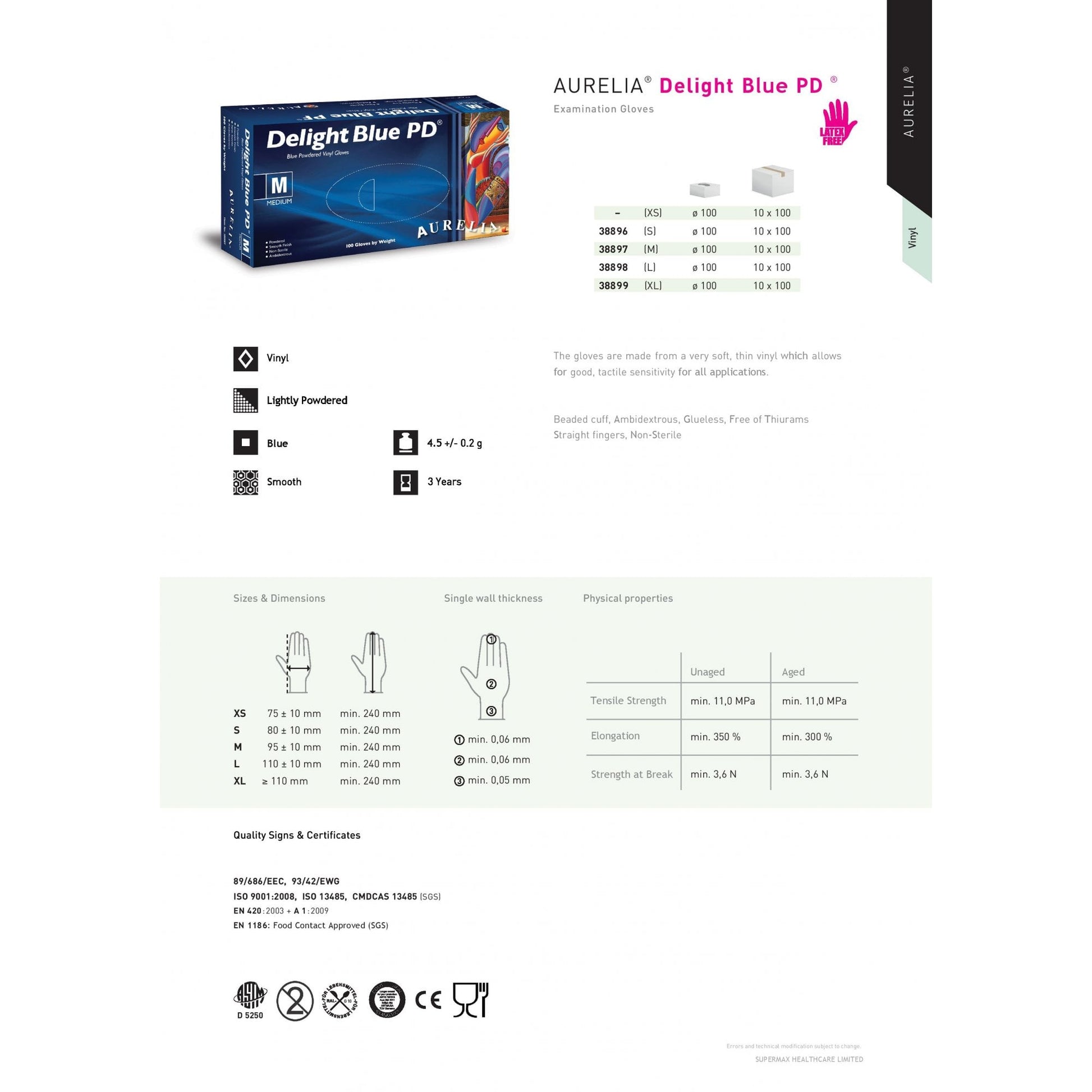 These DELIGHT BLUE vinyl gloves from the renowned Aurelia brand come pre-powdered for increased user comfort and perspiration absorption.